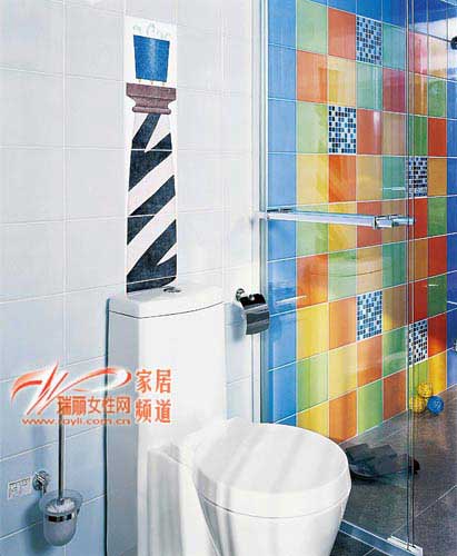 設(shè)有淋浴房的衛(wèi)浴間,可以選取自己喜歡的顏色,多挑幾種色調(diào)的彩磚在淋浴房?jī)?nèi)縱向鋪貼一道色彩絢麗的墻面,再選一款顏色的彩磚給這面墻加個(gè)邊框,便能讓絢麗的墻面變身成為一幅裝飾畫。