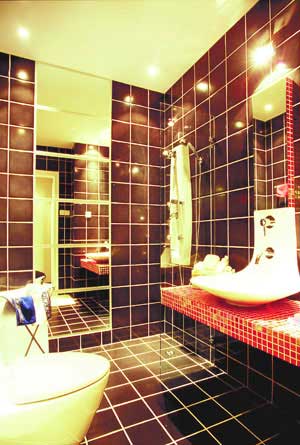 本案利用隔斷墻把衛(wèi)生間分割成兩個相對獨立的小天地。深棕色的運用,讓洗手池、玻璃鏡、儲物柜,巧妙地完成了呼應,凝練中不失簡潔,貫徹了居室現(xiàn)代、時尚的宗旨,而透明淋浴房則通過視覺的延展,緩解了空間狹小帶來的壓迫感。