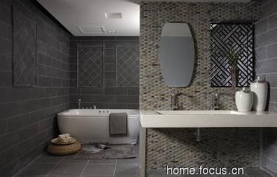 “秦磚漢瓦”在整體設(shè)計(jì)中,延用了中式內(nèi)斂的風(fēng)格特點(diǎn),運(yùn)用貫穿式主題墻的理念,實(shí)現(xiàn)了浴室的干濕分區(qū)。墻面上斑駁的瓦片磚,帶著歲月流逝后滄桑的痕跡。浴鏡右側(cè)的墻體被創(chuàng)意性地挖空,取而代之一扇實(shí)木中式窗花,依稀可見(jiàn)傳統(tǒng)中式古典主義之風(fēng)。浴室外部采用了寬大的天然石臺(tái)面代替浴室柜,拋棄一切多余的線(xiàn)條和裝飾,彰顯出主人的高雅品味。內(nèi)部則采用白色矩形按摩浴缸,在浴缸和潔具向上延升的墻面均以45度斜向鋪貼了與整個(gè)空間同色系的小磚,并以瓦楞磚收口,是典型的中國(guó)四合院設(shè)計(jì)方式,營(yíng)造出濃重的中式主義風(fēng)格。