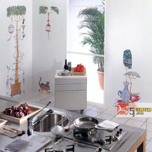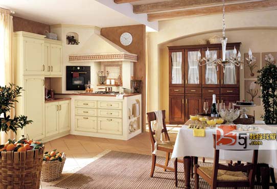 在這種色彩環(huán)境里,可以清爽為主導。鄉(xiāng)土氣息的顏色搭配讓人神清氣爽。相比于地面,墻面顯然有更大的發(fā)揮余地,因此是最好的表現(xiàn)場所。圖案是調(diào)制田園味道不可缺少的組成部分,精美圖案的組織安排,四方聯(lián)的整塊使用或二方聯(lián)的連續(xù)使用都會很容易被人接受。明亮的空間是讓空氣感到清新的重要因素,顏色含灰度不能高,要始終保持一定的亮度。而高明度的原木色或略含灰度的藍綠色在色彩感覺上比較對味,也更適合廚房。