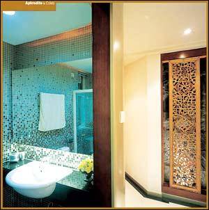 一般的普通住宅浴室,可安裝取暖、照明、排氣三合一的"浴霸"、普通的浴缸、坐便器、臺式洗面盆、冷熱沖洗器、浴簾、毛巾架、浴鏡等。地面、墻面貼瓷磚,頂部可采用塑料板或有機(jī)玻璃吊頂。面積小的浴室,應(yīng)注意合理利用有限的空間,淋浴器比浴缸顯得經(jīng)濟(jì)與方便,臉盆可采用托架式,墻體空間可利用來做些小壁櫥、鏡面箱等,用來放置些零星物品。墻上門后可安裝掛鉤,用于掛衣帽之類物品。