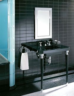 潮流輪換,黑色始終為時(shí)尚人士所鐘愛(ài)。高光的長(zhǎng)方形黑色瓷磚,配以地面的黑色馬賽克,黑色的面盆,白色的毛巾,不銹鋼的浴室配件,風(fēng)格顯得大膽而現(xiàn)代。