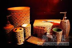 這套衛(wèi)浴組合,很有一番南亞風情,仿造南亞草席做出了外觀,雖然造型簡單,但于平凡中展現(xiàn)出古樸的韻味。另一套仿南亞掛毯做出的衛(wèi)浴六件套,圖案工整,星星點點的寶石散落其中。