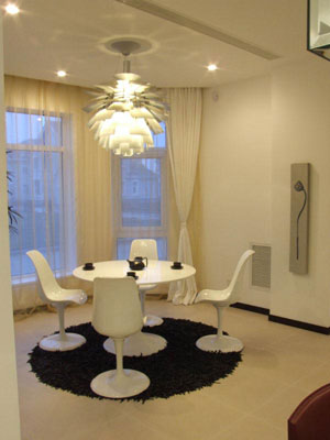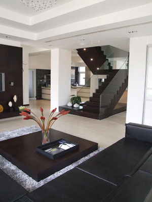 25塊黑橡木掛墻板,將客廳與餐廳巧妙分割,餐廳空間整齊而不失富麗,黑與白搭配出一派純粹的傲慢與高貴?蛷d低矮的沙發(fā)茶幾,憑借橫平豎直的幾何體傳遞頓錯有力的節(jié)奏感,淺色的腳踏和艷麗的配飾,凸現(xiàn)空間剛?cè)岵膭e樣風(fēng)情。