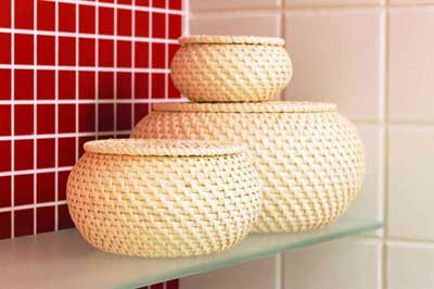 編織式收納罐,大有大的用途,小有小的道理;蛘呷繑[出來,勾勒幅“吉祥三寶”的景象,讓爸爸、媽媽和孩子都收納有道。而且罐蓋能有效避塵,還具私密性,避免了來客用衛(wèi)浴間的不方便。手工編制,民俗特色,與衛(wèi)浴間的現(xiàn)代風(fēng)格形成對比,是現(xiàn)今流行的混搭派。