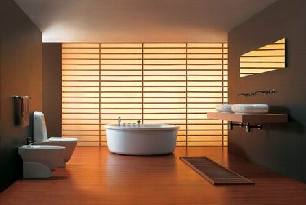 奢華空間 圓形的臺(tái)盆和浴缸給人以奢華的感覺,木質(zhì)的踏板和移門設(shè)計(jì),給人以濃重的懷舊感。