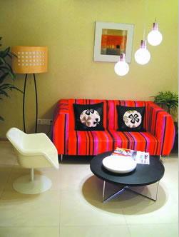 。蹠(huì)客區(qū)]這里的每一樣家具和擺設(shè)都是家具店里最常見的,可是,當(dāng)他們安靜的靠在一起,就成了這首曲子最完美的部分。紅赫條紋布藝沙發(fā)帶有女人的嬌艷和男人的內(nèi)斂,張揚(yáng)中舒緩著沉穩(wěn)。永恒的黑白配似乎也成了線譜上的音符,白的擔(dān)任靠椅,黑的圓形小茶幾,視覺對比的沖撞中帶出了旋律般的美感。在固有在美麗中,是沙發(fā)后探出頭來的綠意賦予了樂曲生命,生活的氣息,就在這不經(jīng)意的目光所及中彌漫。