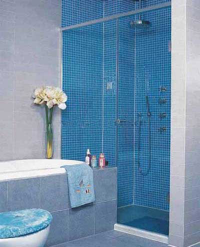 “整體浴房”的透明玻璃墻體與藍(lán)色馬賽克的組合,使空間顯得開(kāi)闊,質(zhì)感搭配更和諧。