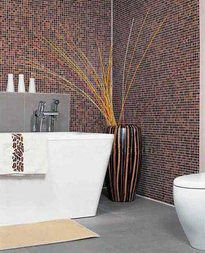 棕色給人一種沉穩(wěn)、高貴之感,大面積的棕色馬賽克和造型硬朗的浴具搭配,營(yíng)造出平穩(wěn)卻不乏生動(dòng)的空間。以下面的例子為榜樣,現(xiàn)在就拆解棕調(diào)衛(wèi)浴的打造招數(shù)!