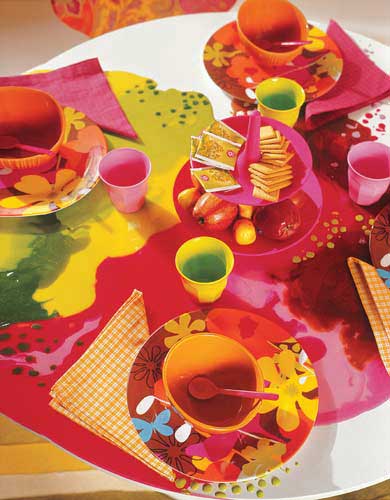 這是一個已經(jīng)布置好的餐桌,熱愛花朵的我們同樣可以擁有。買一些鮮艷花朵圖案的餐盤,水杯、碗、小勺、和放食物的小架子,全部要使用漂亮的花朵顏色。不要忘了餐巾,橙色和粉色的餐巾搭配在這樣花團(tuán)錦簇的餐桌上才適合!