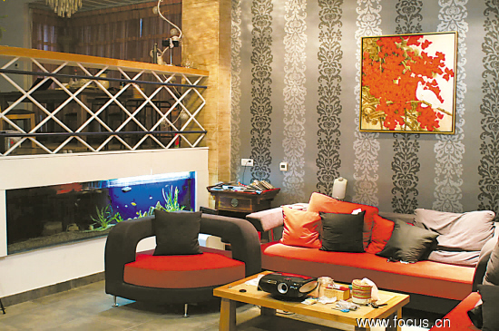 錯(cuò)層的客廳,吧臺(tái)下面的小半面墻上鑲了個(gè)大魚缸