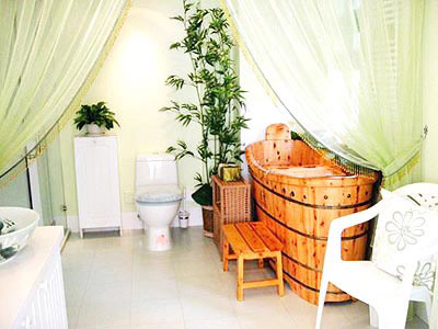 淺綠色的簾幕背景、綠色的植物的點(diǎn)綴、傳統(tǒng)的木質(zhì)浴盆使整個空間充滿了回歸自然的韻味。