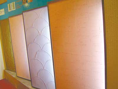 展位負(fù)責(zé)人介紹說(shuō),硅藻土具有細(xì)膩、松散、質(zhì)輕、多孔、吸水和滲透性強(qiáng)的特性,以硅藻土為原材料生產(chǎn)出來(lái)的建筑材料,不僅具有不燃燒、除濕、除異味及通透性好的特點(diǎn),而且還能夠凈化空氣、調(diào)濕、隔音、保溫、隔熱等。硅藻土的本色有白色、灰白色、灰色或淺灰褐色等,為保證環(huán)保性和穩(wěn)定性,這種添加不會(huì)氧化變色的礦物顏料制成的墻面材料均為淡色系。直接涂刮在墻面約2.5毫米左右,墻面可以做成平面效果、含稻草的粗面墻及劃痕、堆印等各類(lèi)立體花紋。