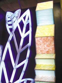 據(jù)展位負(fù)責(zé)人介紹,人造透光石具有無(wú)毒性、無(wú)放射性、阻燃性、不粘油、不滲污、抗菌防霉、耐磨、耐沖擊、易保養(yǎng)、拼接無(wú)縫、任意造型等優(yōu)點(diǎn),兼?zhèn)浯罄硎⒂袷奶烊毁|(zhì)感和堅(jiān)固的質(zhì)地,重量?jī)H為天然石材1/4左右,且無(wú)毛細(xì)孔、色彩豐富、易打理、加工快捷,屬于綠色環(huán)保建材,并可根椐實(shí)際需求隨意彎曲。