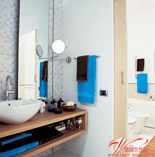 在另外一個衛(wèi)浴間的面盆下,有另一種利用空間做收納的方法?梢詫⑾词_做成一個開放式的抽屜,收納毛巾、浴巾、洗漱用品和護膚品,擁有良好的透氣性的同時,還可以成為一個展示空間。