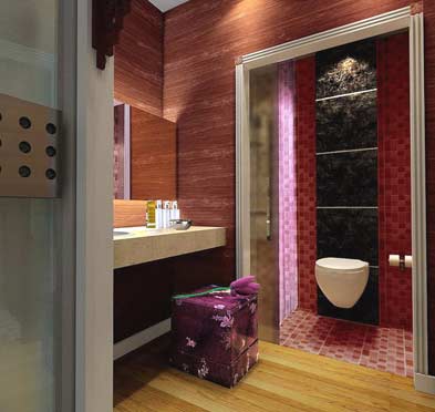 那是個(gè)抽水馬桶嗎?它難道不更像一個(gè)寶座嗎?不但馬桶本身居于嚴(yán)格對(duì)稱的布局正中,就連唯一的植物都在強(qiáng)調(diào)著這個(gè)抽水馬桶的不可一世?瓷先ィ@個(gè)衛(wèi)浴間更像是以這個(gè)馬桶為中心設(shè)計(jì)的。在馬桶周圍不僅強(qiáng)調(diào)格局的對(duì)稱,而且到處都是圓形和方塊。這兩種圖案鋪滿了墻壁,就連鏡子和盥洗池都是。再加上整齊排列的頂燈和墻圍上的大量的直線條,這個(gè)衛(wèi)浴間的主人是個(gè)有點(diǎn)自我中心的人,他重視自己的地位和權(quán)威,嚴(yán)謹(jǐn)而不散漫。