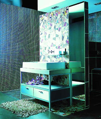 如果你的墻面底色較深就運(yùn)用博洛尼最大膽goodfeel的POP花色瓷磚作為主題墻裝飾墻面吧。讓報紙堆砌出的亮麗色彩大面積裝飾,拼貼的效果會使浴室設(shè)計看起來更加大氣,配上熠熠生輝拉絲鋁浴室家具和亮面鏡子絕對拉風(fēng)。張揚(yáng)的創(chuàng)意是時尚年輕人不二的選擇。