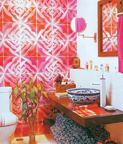 仿古地磚腳感一般都很舒適,踩上去有踏實(shí)、溫暖、放松的感覺,突破了瓷磚腳感不如木地板的傳統(tǒng)。大紅玫瑰花朵圖案的洗手盆把夏日的熱烈奔放帶進(jìn)衛(wèi)浴空間,古典中帶著幾許浪漫。
