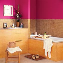 這個(gè)衛(wèi)浴間有著現(xiàn)代和傳統(tǒng)兩種元素的痕跡,浴缸和面盆都是十分普通的,所用的馬賽克和地磚種類也都是物美價(jià)廉的裝修材料。但它們卻用了大膽的相互結(jié)合的手法,墻的上半部采用十分強(qiáng)烈的紅顏色,浴缸和面盆都用木貼面裝飾,并以馬賽克做鑲邊,飾品和輔助的家具運(yùn)用傳統(tǒng)的樣式和材料,一間特殊味道的衛(wèi)浴間就形成了。