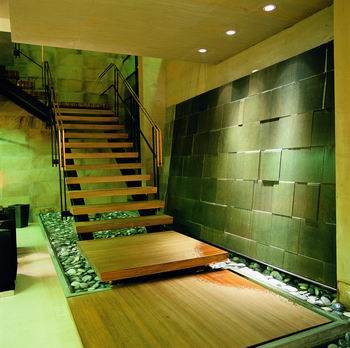 通向二樓私密空間的樓梯、水瀑、池塘。從這里開始,樓下社交層的華麗開始轉(zhuǎn)為私密空間的簡單質(zhì)樸。在材質(zhì)上,這個(gè)空間選用的是樸拙可塑的砂巖、厚重的大檀木、堅(jiān)硬銳利的黑色鋼鐵。