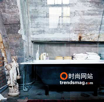 自然裸露的弧形水泥墻前,一面玻璃隔擋守候著一個(gè)寬大的浴盆。