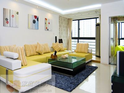 客廳使人眼前一亮,在客廳里沒有多余的裝飾,白色的墻壁顯得客廳既清爽又簡潔?匆妷Ρ谏蠏斓娜嬃藛幔繐(jù)說那個是一大幅畫拆成九幅小畫這是其中的三幅,真的是既有創(chuàng)意又體現(xiàn)了現(xiàn)代印象風(fēng)?蛷d沒有用鋪實木地板而采用了米色玻化磚,;u顯得客廳更明亮更寬敞而且日常打掃也方便,這也是很多小客廳現(xiàn)代風(fēng)格的另一個標志。客廳里的沙發(fā)很搶眼,黃白搭配在一起感覺特別的養(yǎng)眼與溫馨。深藍色的地毯體現(xiàn)了客廳的穩(wěn)重感與深色的茶幾色系上相呼應(yīng),使客廳顯得更具有色彩層次感。