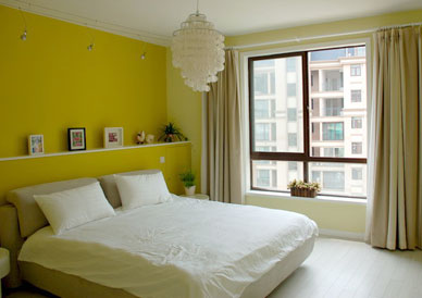 走進(jìn)臥室使人眼前一亮,黃色的主墻色;蛟S是很少看見有人把臥室的墻壁做成黃色吧,認(rèn)為這些大膽的色彩只有用在樣板房里。但事實(shí)是這樣的效果真的是很不錯,白色的頂、淡色的地板與黃色的墻正好做到了區(qū)分,使空間不但沒有因?yàn)椴噬膲ψ兊每臻g狹小反而從視覺上拉伸了,使空間看起來更加明亮(稍加觀察可以發(fā)現(xiàn)窗臺下面的墻壁選用的是淡黃色,這樣使空間看起來具有拉伸與窗子之間的距離感)。床頭的白色隔板使空間看來更見精致,床頭的射燈照在隔板的裝飾上顯得很漂亮。臥室里的窗簾色與床本身的色彩相呼應(yīng),使空間看起來色彩很協(xié)調(diào)。具有藝術(shù)氣質(zhì)的吊頂在臥室則起來到點(diǎn)睛之用,使空間看起來更具現(xiàn)代化。(臥室里色彩盡量以淡色系或溫暖色彩為主。臥室畢竟是讓人最愜意的空間,所以在臥室色彩上選用色彩得注意,避免產(chǎn)生視覺疲勞)。