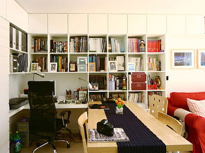 老公房空間小,是眾所周知的。但現(xiàn)在生活書房、餐廳、客廳是必須具有的三個(gè)生活空間?臻g小的話那么可以試著像這樣把三個(gè)空間合并在一起,視覺效果也是不錯(cuò)的。但具體情況還是要看業(yè)主的生活方式,本案例中的業(yè)主兩人都是建筑師工作時(shí)需要較大的工作臺(tái)畫圖紙的時(shí)候感覺舒服,這個(gè)時(shí)候餐廳就可以變成工作室,餐桌就成了寫字臺(tái)。