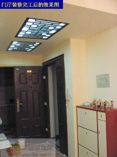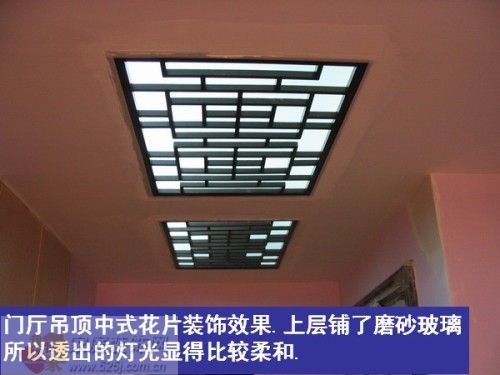 門廳吊頂不是例常單一的燈具,而是鑲嵌在吊頂里面的中式花片式的吊燈,而磨砂的玻璃,更讓這款吊燈顯得有古代窗欞的感覺,而本身的造型,就有點(diǎn)像古房中的天窗,只是這個(gè)天窗非常具有中式的風(fēng)格。