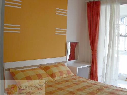 同樣的色調(diào)運(yùn)用的理念還是用在了主臥室里,這個(gè)小臥室的裝飾裝修側(cè)重了臥床墻面的效果,大塊橘黃亮色的使用,增大了住戶心理預(yù)期,讓心靈得以悸動(dòng),并且,墻面石膏板材質(zhì)還做到了頂上,裝置兩盞射燈,也為主人在床頭閱讀提供了方便,做到功能和效果兩不誤。