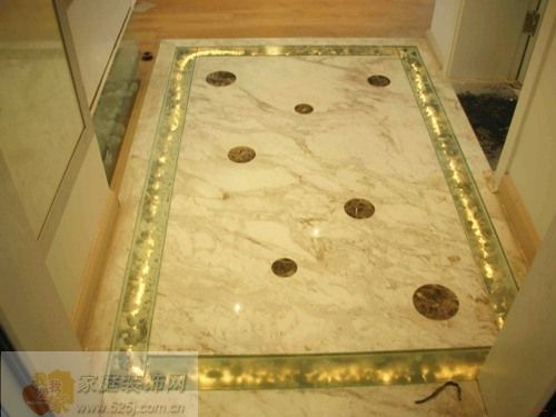 考慮到該區(qū)域人進人出的頻率最高,木地板長時間踩踏很容易磨損,作為設計亮點,陳大師劃了塊進門處兩三平米的地兒,地上鋪大理石,中間有彩色拼花,大理石周圍一圈鋪鵝卵石,黃色燈帶嵌在鵝卵石中,鵝卵石上玻璃,玻璃與地面形成一個臺階,就用不銹鋼包邊。整個感覺有點像越樣樓記走廊。