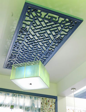 餐廳里的花板吊頂把中式復(fù)古風(fēng)格體現(xiàn)的淋漓盡致。這樣的花板買回來是紅木色的,為突出整體色彩而噴成了藍(lán)色,效果不錯(cuò)哦,配上一盞簡潔現(xiàn)代感十足的吊燈,中式風(fēng)格這種表現(xiàn)使整個(gè)空間,傳統(tǒng)中透著現(xiàn)代,現(xiàn)代中揉著古典。