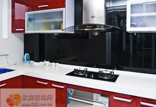 廚房空間采用了黑色、紅色、白色為主色調(diào),這三種顏色搭配在一起感覺很漂亮也很經(jīng)典。在櫥柜的后面設(shè)計(jì)師采用了黑色烤漆做裝飾墻,這不僅是從整個(gè)設(shè)計(jì)上做考慮更多的是為日常生活,黑色烤漆不僅漂亮而且還很容易清潔,經(jīng)常使用廚房的話避免不了油膩,但油膩又很難清潔,而做烤漆就避免了這樣的問題,而且時(shí)間長了也不會(huì)留下發(fā)黃的斑點(diǎn)。紅色的的烤漆櫥柜很耀眼,多樣的儲(chǔ)蓄空間也為它增加了色彩,有了這樣的櫥柜以后廚房就不會(huì)再是凌亂不堪了,很實(shí)用的櫥柜設(shè)計(jì)。白色的臺(tái)面感覺很漂亮很整潔,使空間看起來多了份活潑感。在整個(gè)廚房里設(shè)計(jì)師采用了烤漆處理,使這個(gè)原本空間不大的開放式廚房看起來很開闊很明亮。