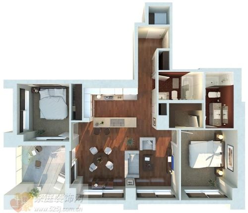 這是一套兩房?jī)蓮d兩衛(wèi)的公寓,因?yàn)槲魇讲惋嬘糜土枯^少,所以廚房都作成敞開(kāi)式,這在下面兩個(gè)案例中也是。這樣做的好處就是建筑師進(jìn)行室內(nèi)房型設(shè)計(jì)的時(shí)候可以避免考慮廚房的影響,而只要增加客廳面積就可以開(kāi)辟出一塊烹飪區(qū)域,并且,客廳、餐廳、廚房聯(lián)體的方式也使這一區(qū)域的利用率、視覺(jué)感覺(jué)都能達(dá)到最大。