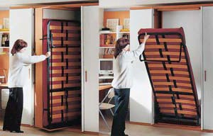 ■ 儲物柜中的尺寸為231.20厘米x60.60厘米x100厘米的收納柜,作為單人床,100厘米的寬度完全能滿足一個人的休息需要,床的折疊軸安設(shè)在離地面大約30厘米的位置,加上床墊的厚度剛好合乎人40厘米的坐高。當(dāng)床被立起來的時候,所需的空間僅僅是用來放置床墊和襯板的空間,它們的厚度加起來也不過20厘米。為了解決轉(zhuǎn)換方面的問題,在其中部位置安插了一根立柱作為轉(zhuǎn)換軸,這樣,以50厘米為半徑旋轉(zhuǎn),最后,一個重要的細(xì)節(jié)就是,為了避免因旋轉(zhuǎn)而預(yù)留的狹長縫隙暴露在外,該設(shè)計還特別在旋轉(zhuǎn)單元的兩側(cè)加上了門蓋。