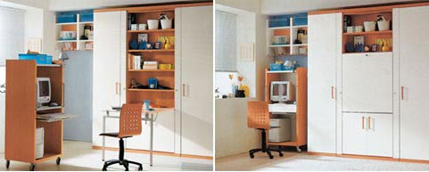 ■ 作為儲物柜,翻轉(zhuǎn)下來的柜門直接可以用做書寫臺。巧妙地將折疊起來的單人床與淺擱架共同分享60.60厘米的柜深。