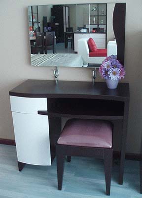 梳妝臺屬不常用家具,小些即可,而梳妝鏡大些則可開闊視野,"擴(kuò)大空間",鏡子本身又不多占地方。