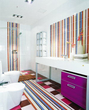 彩色的感官主義風(fēng)格為年輕的現(xiàn)代女孩們量身定做了一個(gè)充滿奇思妙想的衛(wèi)浴空間。條紋的花磚流露著男孩的陽(yáng)剛之氣,而兩邊絢出的彩色恰恰是豎條花磚上的顏色,當(dāng)這種顏色一旦獨(dú)立出來(lái)就顯得嫵媚動(dòng)人,充滿女性色彩。對(duì)應(yīng)這種感覺(jué),所有的潔具造型均是柔和的圓形,而五金龍頭花灑全部是充滿男性色彩的不銹鋼材質(zhì)加方形造型,使得房間所有的顏色和物品在對(duì)比中統(tǒng)一與融合,滿足年輕一族在經(jīng)濟(jì)上的需求。絢麗緞帶般的墻面與彩色地面自然銜接和大面積的潔白墻面形成強(qiáng)烈的視覺(jué)感官?zèng)_擊,猶如雨后天空的彩虹把人帶入一個(gè)新的空間領(lǐng)域。