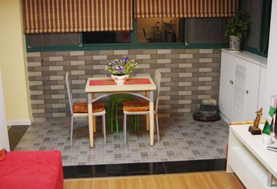 由于陽臺是西曬,所以用了比較遮光的竹簾,加上冷色的墻磚和地磚,希望以后可以涼快點。和廚房的墻磚有點像哦,嗯,怎么越來越喜歡灰色了呢?