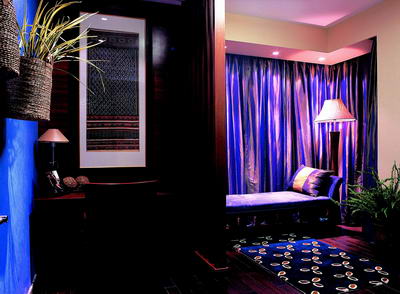 東南亞風(fēng)情,舒張中有含蓄,嫵媚中帶神秘,兼具平和與激情。把家打造成濃艷綺麗的東南亞風(fēng)情,它所帶來的不僅是視覺的錦繡多彩,更是生活的曼妙體驗(yàn)。藍(lán)紫色的窗簾、地毯與床鋪打造出一個神秘異樣的睡眠空間。雖然面積并不怎么大,但整個空間充滿著無窮的魅惑感與迷幻感。