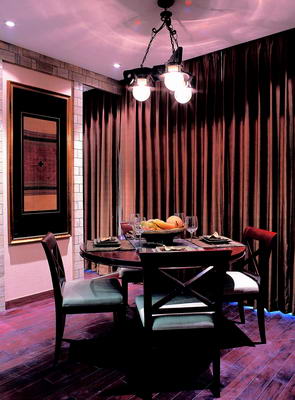 與客廳相鄰的是個簡單的小餐廳,簡潔利索的家具設(shè)置與燈光營造令整個餐廳顯得精致小巧,富有濃厚的生活情趣。與深櫻桃木色相配合,設(shè)計師在此處的窗簾設(shè)計上采用了穩(wěn)重卻帶有變化的淺棕色。雖然棕色會帶有沉重的厚實(shí)感,但隨著米色椅墊與暈黃燈光的渲染,整個色調(diào)顯得清爽了許多,伴隨著棕色窗簾的諸多色澤變化,整個餐廳充滿神秘氣息,富有濃郁的浪漫情調(diào)。