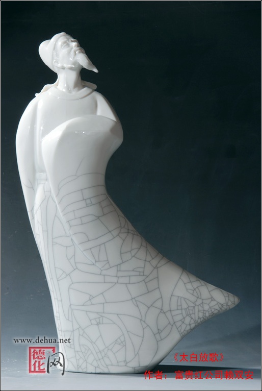 作品形體塊面間的柔和過渡,給人以圓潤、飽滿的形態(tài)生命感,張馳不一的裂紋釉表面肌理暗示著這種生命力的穿透和牽引。簡練概括的雕塑手法亦表達了作者面對精神偶像“詩仙”李白一種在情感選擇上純粹的崇敬。