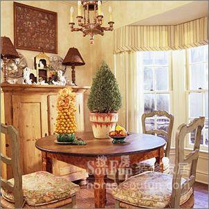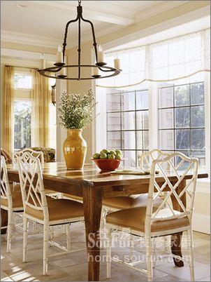 如果你的餐廳鄰近其它的起居空間。那么建議兩個空間用同一種顏色做基調(diào),再選擇一些不同的,但與主色調(diào)相近的小裝飾品點綴。本圖餐廳,主人就選用了淡黃色的紗簾,金黃色的椅套,使餐廳整體效果看起來和諧,明快。