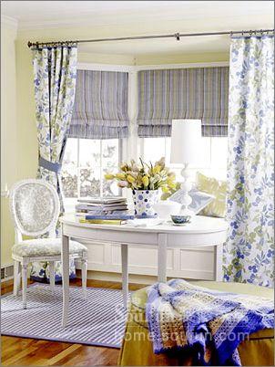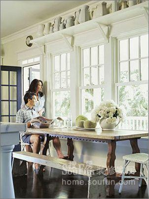 本圖中的休閑餐廳布置得非常優(yōu)雅清爽。盡管空間很小,但藍(lán)色系的各種織物將白色的餐桌椅烘托得情調(diào)十足,空間也顯得大了很多。