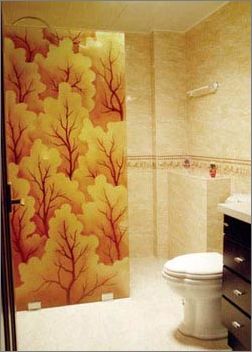如果你的衛(wèi)生間沒有放置浴缸的空間,而你又不喜歡淋浴房,那么使用這樣一款色彩飽和度高的藝術(shù)玻璃作為沐浴區(qū)的隔斷的確是個(gè)聰明的選擇,金黃色的樹葉與墻體、地面的顏色相互輝映,增加了衛(wèi)生間溫暖的感覺。