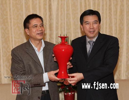 朱清代表省委常委、宣傳部長(zhǎng)唐國(guó)忠向香港商報(bào)贈(zèng)送德化紅瓷