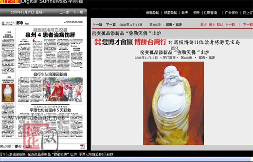“彌勒笑佛” 高60厘米,寬30厘米,長長耳垂,圓圓大肚,袒胸露腹,笑容可掬。頭部、胸部和腹部均采用傳統(tǒng)“中國白”制作工藝,溫潤潔白,質(zhì)感如玉。外衣采用最新研制的極品結(jié)晶釉工藝,金色花狀。