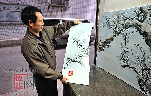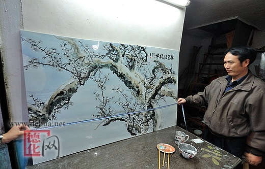 在湖前路,走入“戴云人家”,記者一眼就看到了擺在顯眼位置的這幅畫,畫上一株虬勁的古梅,立地參天,氣度恢宏,猶如一條神龍,張鬣揚(yáng)甲,騰空而起。而讓觀者無不驚嘆的是,這幅畫并不是畫在畫布上的,這是幅瓷板畫,該瓷板畫長1.35米,高0.8米,實(shí)屬一件難得的藝術(shù)珍品,具有很高的收藏價(jià)值。