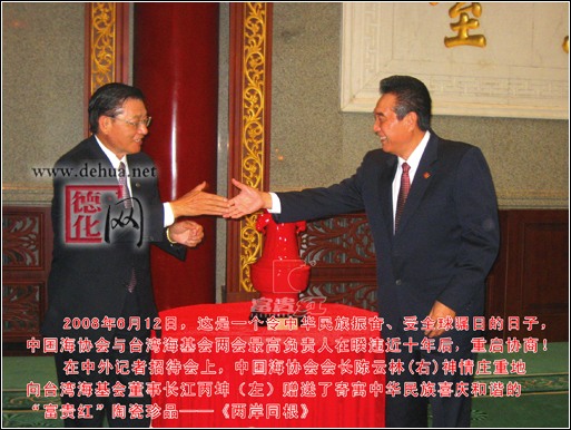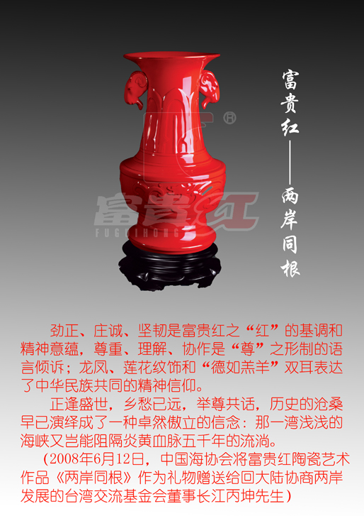 2008年6月13日,海協(xié)、海基兩會最高負責人在睽違近十年后,重啟協(xié)商。當晚出席海協(xié)會歡迎晚宴后,海協(xié)會向海基會贈送了一件由中國瓷都·德化知名品牌“富貴紅”專門創(chuàng)作的陶瓷藝術(shù)品——“兩岸同根”。