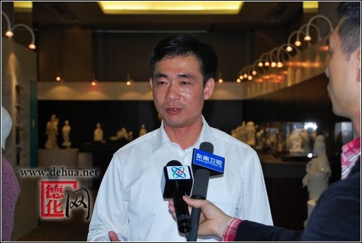 中央臺(tái)駐臺(tái)記者陳軒石在李縣長(zhǎng)的陪同下鑒賞德化白瓷